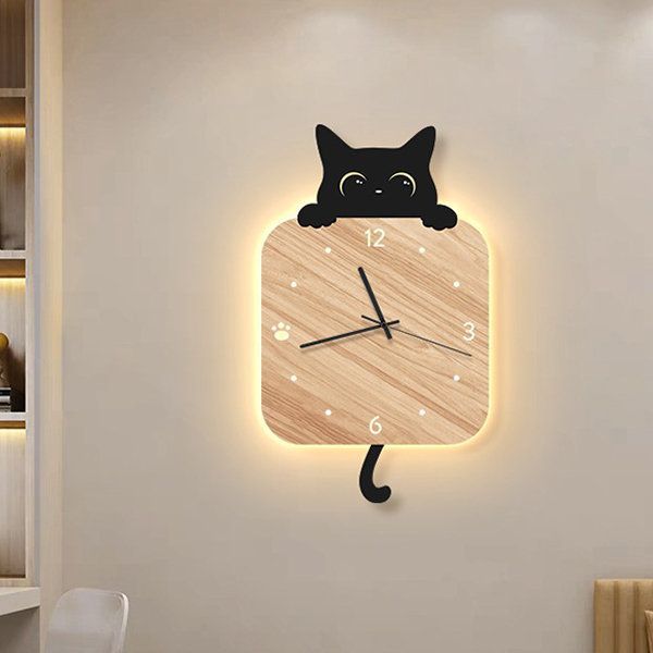 นาฬิกาไม้ทรงสี่เหลี่ยมผืนผ้า ดีไซน์รูปแมวดำแอบมอง มีไฟ LED เรืองแสงด้านหลัง (Warm Light) เข็มเดินเรียบ