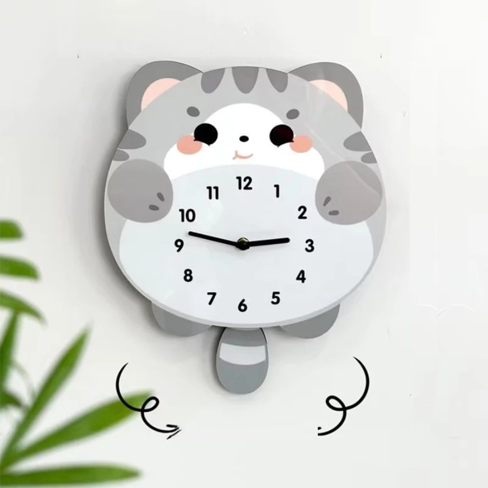นาฬิกาลายหน้าแมวเหมียวสีเทา มีหางลูกตุ้มแกว่ง (Pendulum) วัสดุอะคริลิค/พลาสติก ระบบ Silent Movement